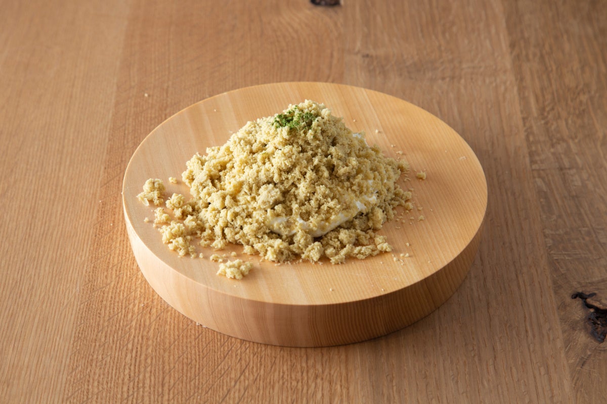 木枠の中には、地元老舗菓子店のカステラ、自家製カスタード、純生クリームを重ね、その上に栗きんとん約4個分に相当するふわふわの国産和栗の栗粉(栗きんとんペーストを丁寧に裏ごししたもの)を贅沢にトッピングしました。仕上げに、沖縄産の海塩を使った抹茶塩をひと振り。これにより、栗本来の甘みが一層引き立ちます。