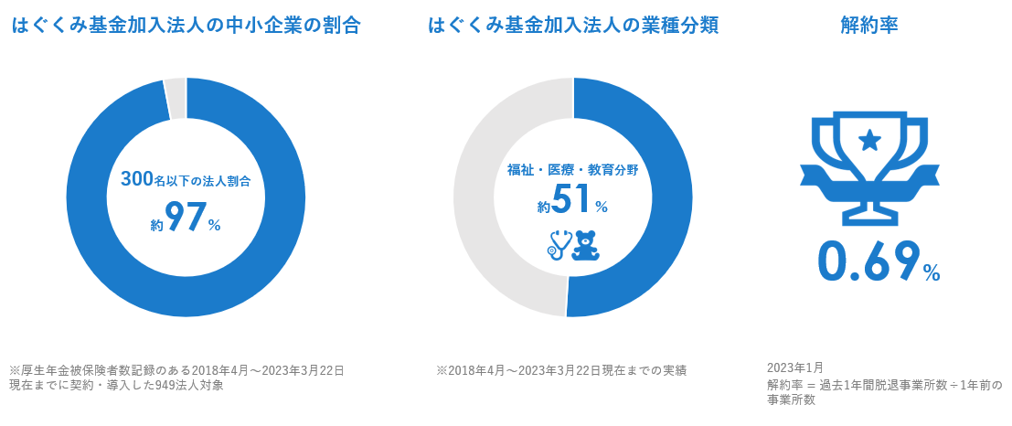 従業員側のメリットには、難しい投資の知識が不要で、元本が保証されていることがあげられます。また、原則60歳以上にならないと受け取りができない企業型DC(企業型確定拠出年金)やiDeCo(個人型確定拠出年金)に比べて、退職時や休職時、育児・介護休業時にも受け取ることが可能なため、育児や介護を将来に控える従業員から厚い支持を集めています。現在、加入事業所のうち73%が医療・福祉関係となっておりますが、他業界の法人様もご加入いただけます。