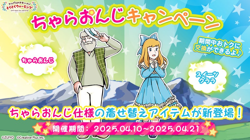 株式会社エムアップホールディングス(所在地:東京都渋谷区、代表取締役:美藤 宏一郎)の連結子会社であり、キャラクターやアニメIPを活用したコンテンツ配信やコラボ実施を手掛ける株式会社 Creative Plus(所在地:東京都渋谷区、代表取締役:加藤 周太郎)は、今年放映50周年を迎えた『アルプスの少女ハイジ(以下、「ハイジ」)』のポイ活アプリ『アルプスの少女ハイジ とくとくウォーキング』(以下、本アプリ)において、「ちゃらおんじキャンペーン」を開始しましたので、下記の通りお知らせいたします。