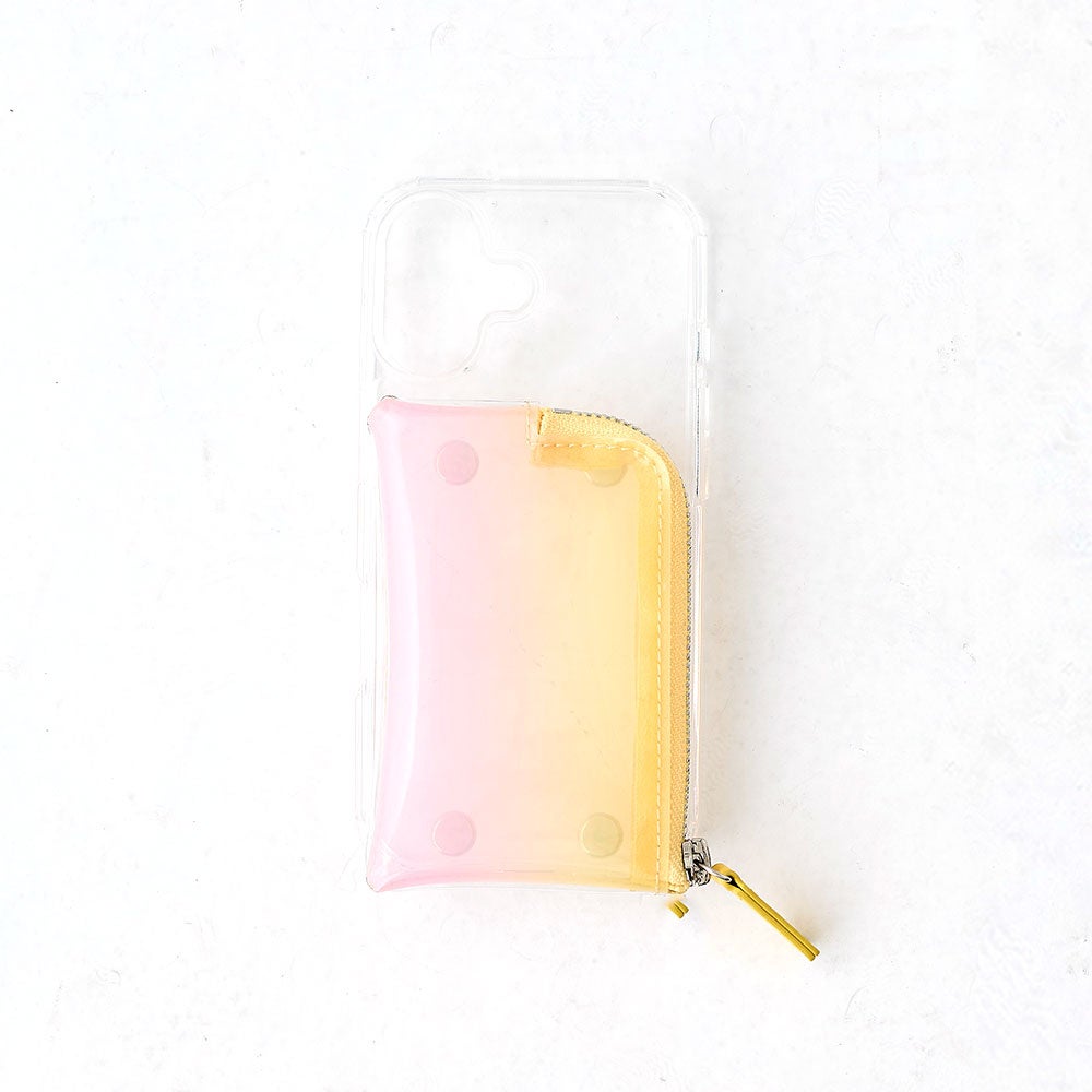 2026SSでは新たに3色登場。透明感あるPVCポケットに春夏らしさあるグラデーションデザインからは、柔らかな「pink yellow」と爽やかな「blue yellow」2色展開でご用意。また、シンプルなオール「clear」ポケットもラインナップ。付属のストラップホルダーを使用するとストラップやショルダー、トレンドのチャームも簡単にカスタム可能。 ケースにステッカーをはさみ込んだり、ポケット内を魅せる収納で遊んだり、自由に楽しめます。