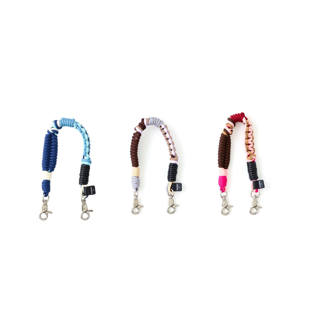 カラー・デザイン・質感の異なるパラコードを編み込んだ定番の「Design paracord」シリーズは、スマホケースやキーホルダー、ポーチのハンドルなどにマルチにカスタムでき、2026SSでは爽やかな「navy×blue」、上品な「purple×choco」、直営店限定「bordeaux×pink」の3色が追加。豊富なカラーバリエーションで、コーディネートやシーンに合わせて自由に付け替えを楽しめる。