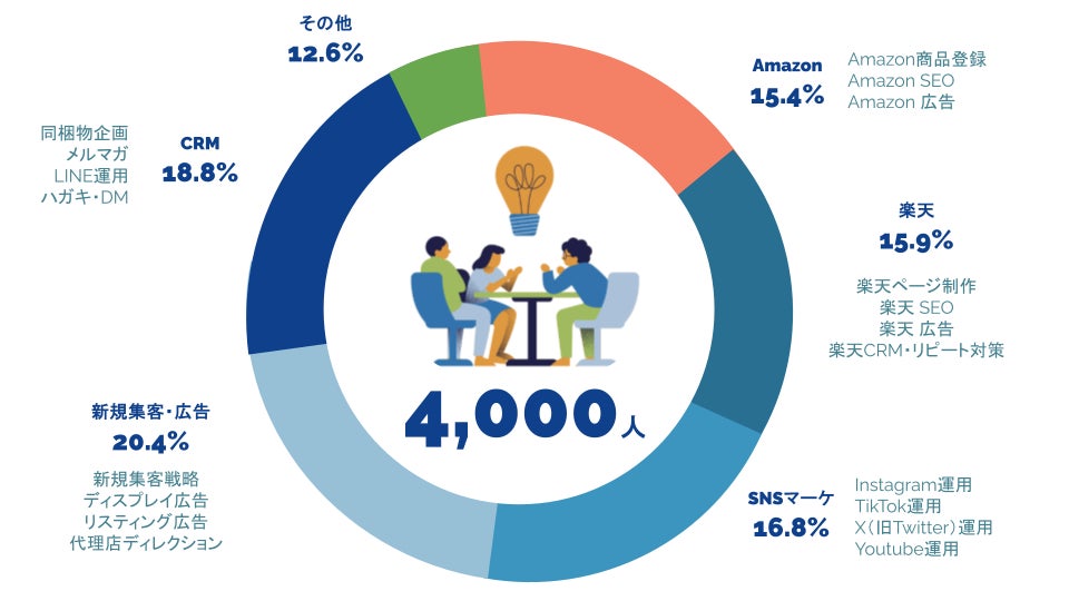 自社EC以外では、Amazon・楽天を専門とするプロがメインで所属しています。それぞれのモールの特性を理解し、モールごとに合わせたマーケティング施策を講じて売上をあげていきます。