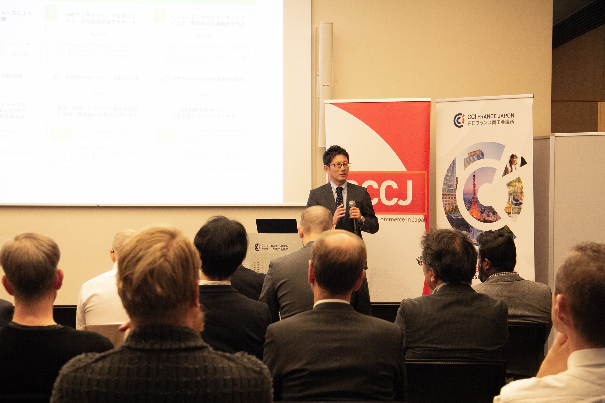 セミナー当日は、当社代表取締役 石川憲優、専務執行役員 ⻄塚淳、常務執行役員 新井裕己、英語通訳としてアソシエイトの何磊が登壇しました。日本の中小企業M&A市場の現状と今後の展望について解説し、経営者の高齢化や後継者不足といった課題に対するM&Aの有用性について実際の事例を交えて紹介しました。加えて、日本の産業構造上における特有の現象である「多重下請け構造」についても触れ、M&A実行により商流を改善し、業績を底上げすることが可能であるというメリットについても解説しました。