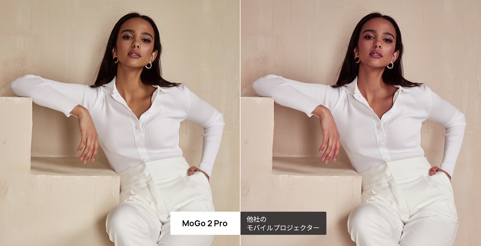 「MoGo 2」シリーズのDCI-P3 90%の広色域は、他のプロジェクターよりもはるかに強力です。それにより、より豊富な色のディテールを投影し、より鮮やかなカラーパフォーマンスを実現しています。「MoGo 2」シリーズで新たに採用したD65の色温度規格は、ハリウッドの映画スタジオで広く使われているものです。映画やオリジナル映像コンテンツが持つべき色のディテールを復元し、よりリアルな映像体験を楽しむことができます。また、色彩表現の精度は非常に高く、キャラクターや風景の色彩の再現性を高め、監督が伝えたい感情や哲学的な意図を十分に体感することができます。