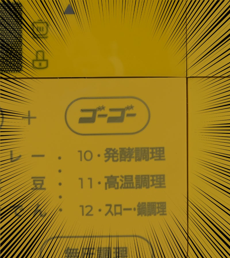 ゴーゴーカレーのロゴ入り「ゴーゴーボタン」を採用。このボタンで全ての調理がスタートし、電気圧力鍋ならではの便利さを実感できます。さらに、本体カラーにはターメリック色の“ゴーゴーイエロー”を採用し、キッチンを華やかに彩ります。