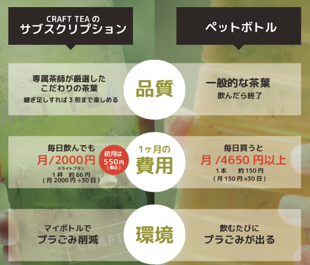 1杯410円〜のお茶を、月額たった2000円で毎日楽しめます。ペットボトルに比べて美味しい上に、経済的にもとってもお得です。ぜひ、公式HPから詳細をご確認ください。