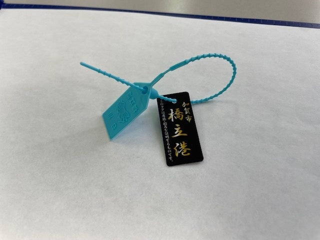 橋立漁港で獲れた雄のズワイガニには、産地証明として「石川」と「橋立港」の名称を刻印した水色のタグと、黒字に金色の「加賀市橋立港」と「漁獲した船の名前」が書かれた2種類のタグが付けられます。これらのタグは、消費者に対して品質と産地の信頼性を保証するものです。