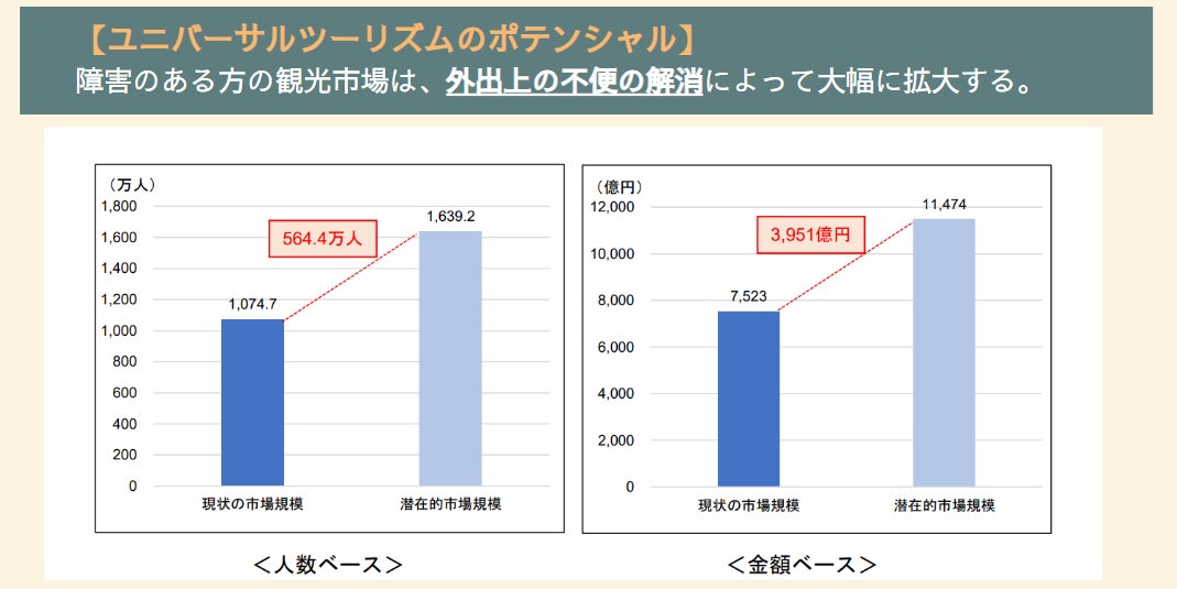 こうした中で、観光庁の試算によれば、障がいのある方に適切なサポートや環境が整えば、年間564万回分の新たな観光需要が生まれるとされています。