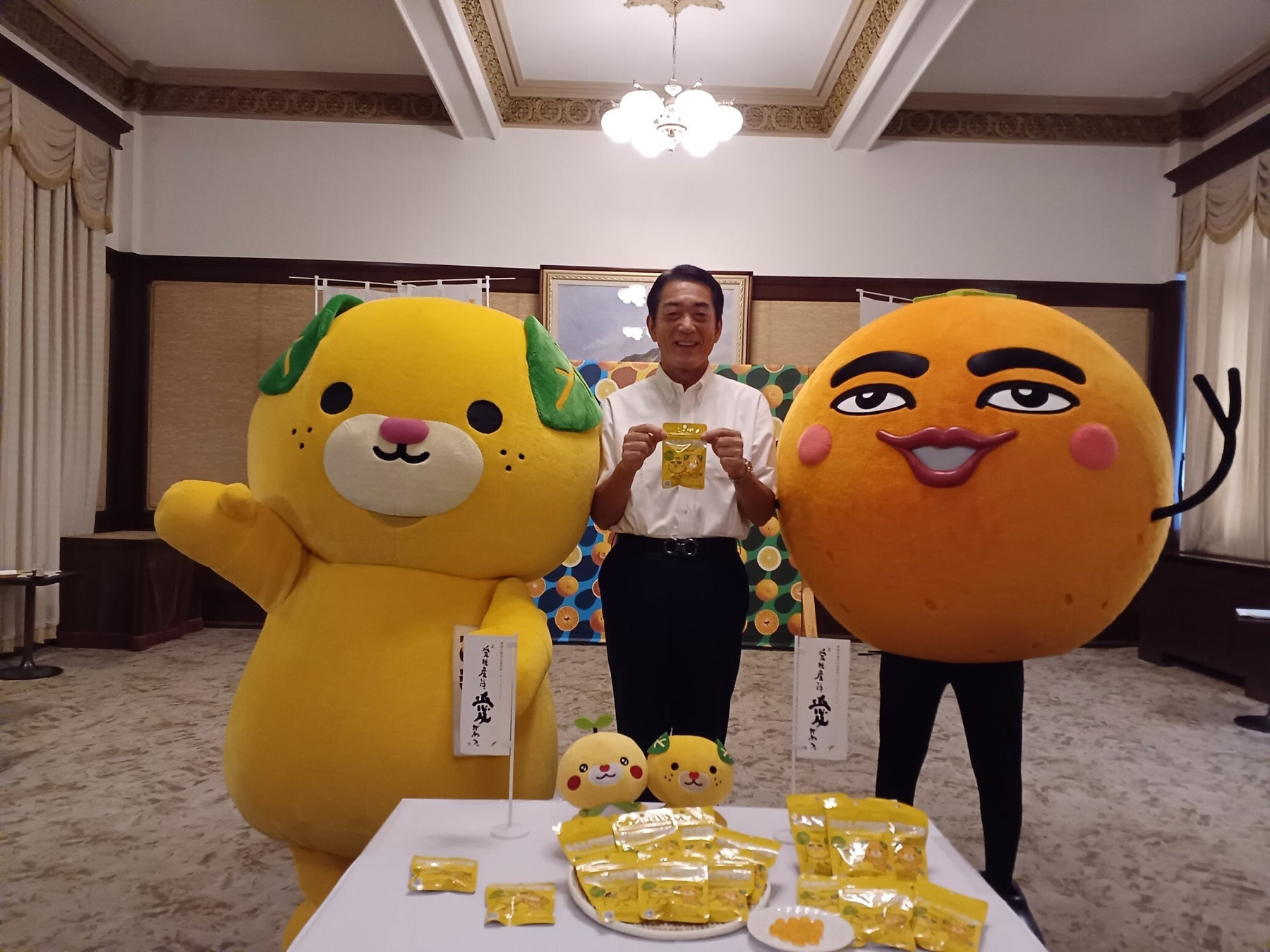 先日、愛媛県知事報告会の場を設けていただき、愛媛県イメージアップキャラクター「みきゃん」と「ミカンせいじん」が見守る中、愛媛県の中村知事にもご報告のうえ、商品をご試食いただきました。