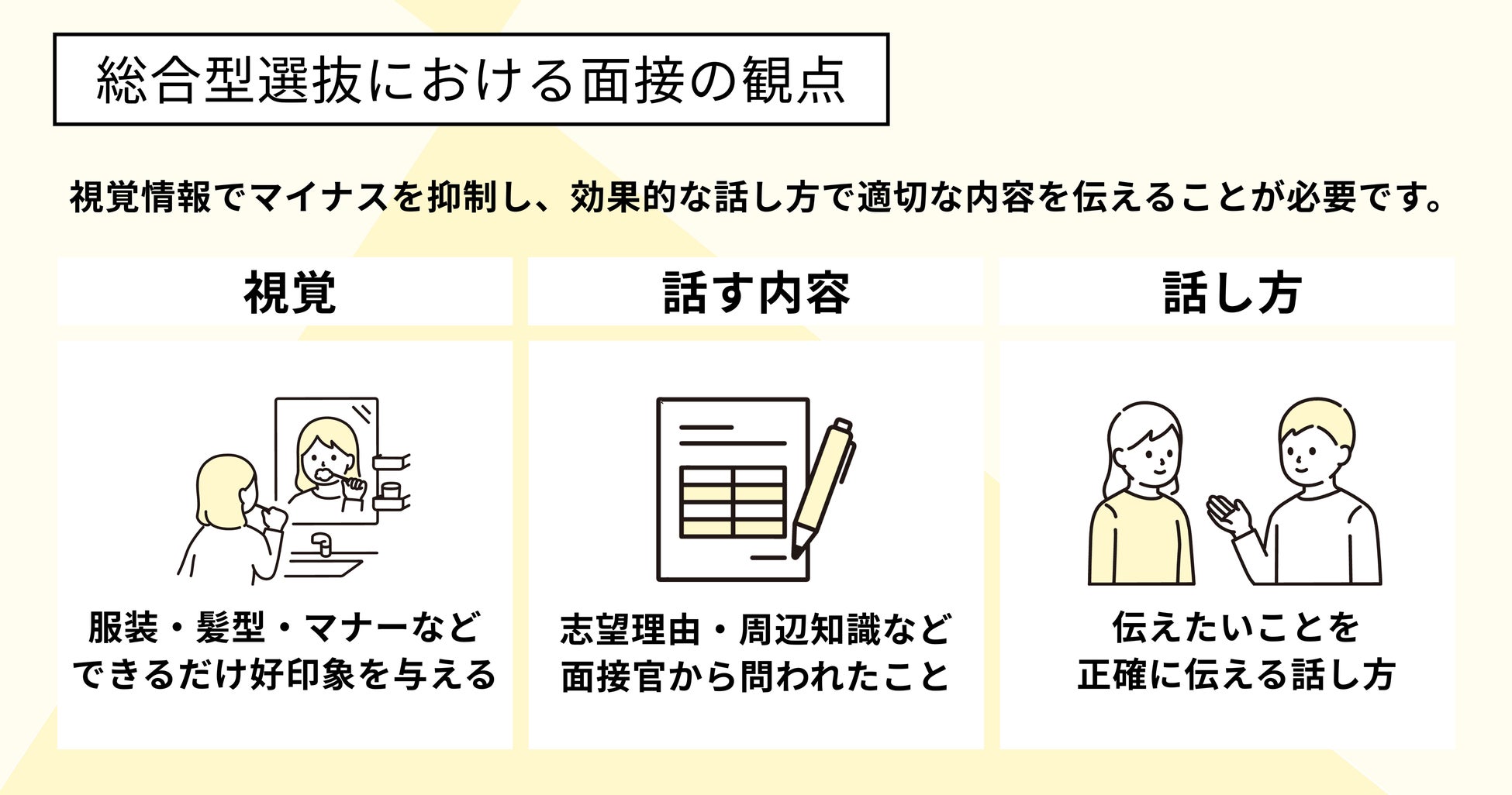 総合型選抜は、大学が求める学生像(アドミッション・ポリシー)に基づき、志望理由書や小論文、面接などを通して受験生を評価する「マッチング入試」です。特に面接や一部の大学で実施されるプレゼンテーションでは、書類だけでは伝わらない受験生の人物像や能力、価値観を直接評価する場として重要な役割を果たします。