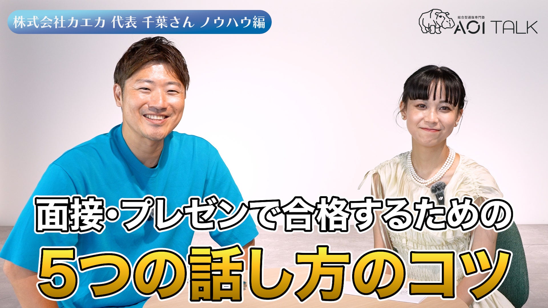 これまでAOI生やAOIの有料コンテンツのみでkaekaの話し方講座を提供して参りましたが、より多くの受験生に「話し方」を身につけてほしいという思いからYouTubeチャンネル「総合型選抜専門塾AOI」にて、株式会社カエカ代表取締役の千葉佳織氏とのコラボ動画を配信いたします。