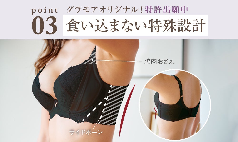 広めのワイヤーを使用し、カップのなかに脇肉や背肉をぐっと入れ込みます。同時に下からバストを持ち上げるよう設計しているため、しっかりとボリュームアップし、離れ胸でも美しい谷間を実現します。