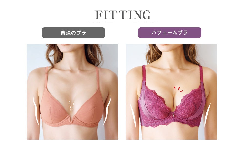 からだを横から見たときに胴が平たい型を「平胴」といいますが、日本人にはこの体型が比較的多いと言われています。平胴体型だと、バストの底面積が広くボリュームが分散されやすいことから、バストが実際のサイズより小さく見えたり、左右の乳房が離れて見えたりすることがあります。そのため、「胸が集まらずに貧相に見える」「ワイヤーの前中心が当たって痛い」「バストが横に広がって太って見える」といった悩みを抱える女性も数多くいます。そうした悩みを解決するために、“離れ胸”の問題解消を目的に設計されたのが「パフュームブラ」です。