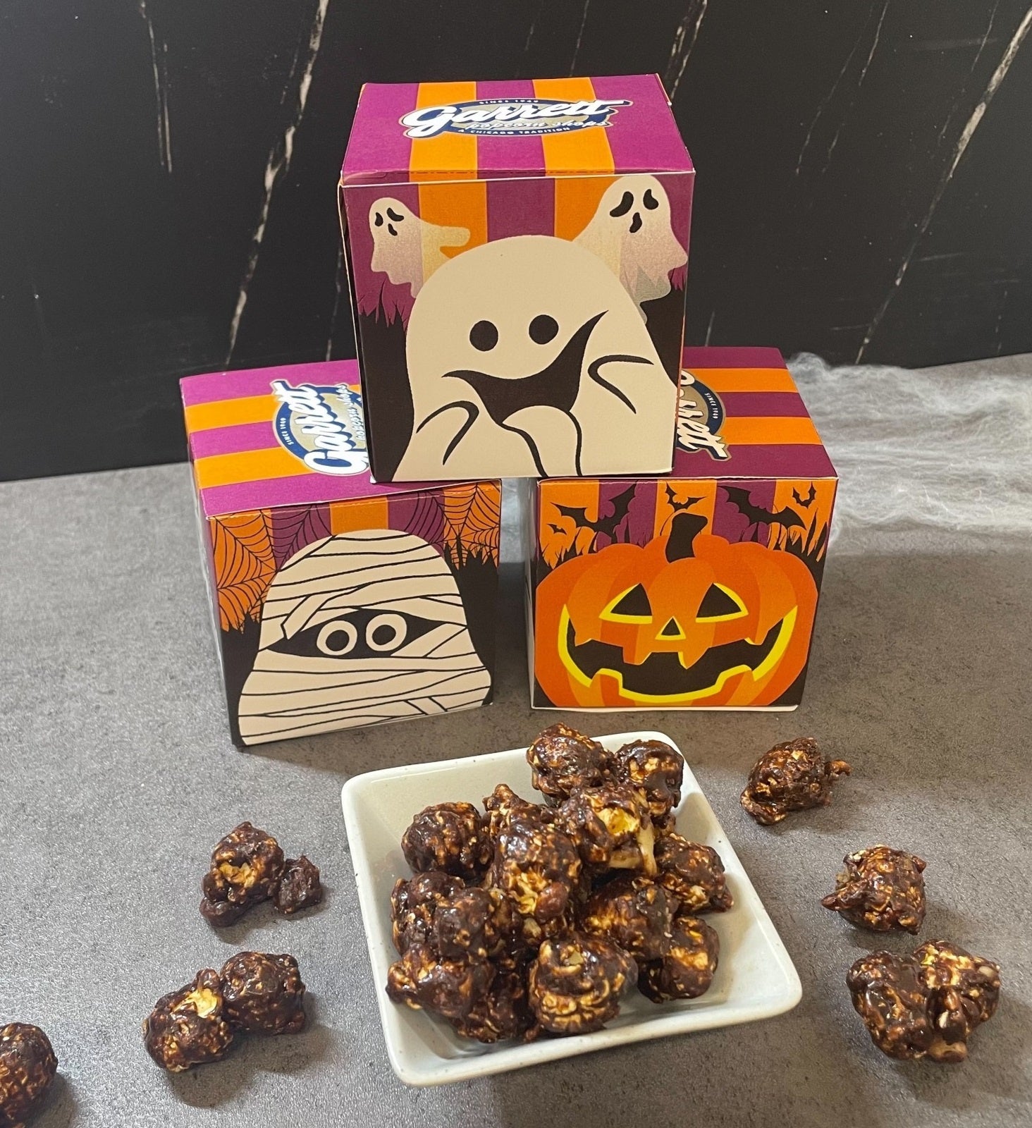 オレンジとパープルのハロウィンカラーのストライプに、ジャック・オー・ランタンやおばけ、ミイラなどおなじみのキャラクターが勢ぞろい。キューブ型のパッケージに人気の『ココアキャラメルクリスプ™』を詰めました。手のひらサイズのパッケージはプチギフトにピッタリ。ハロウィンパーティはもちろん、お友達やお世話になっている方へのプチギフトとしてお使いいただけます。