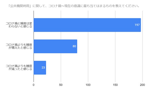 公共機関の利用においては、「コロナ渦と頻度は変わらないと感じる」と回答した方が最も多くなりました。