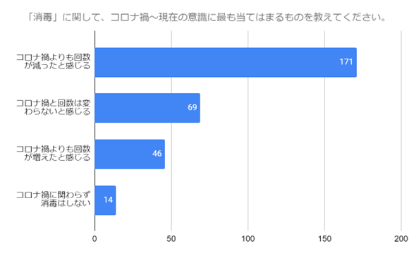 「消毒」は「手洗い」と違い、半数以上の方が「減った」と回答しました。