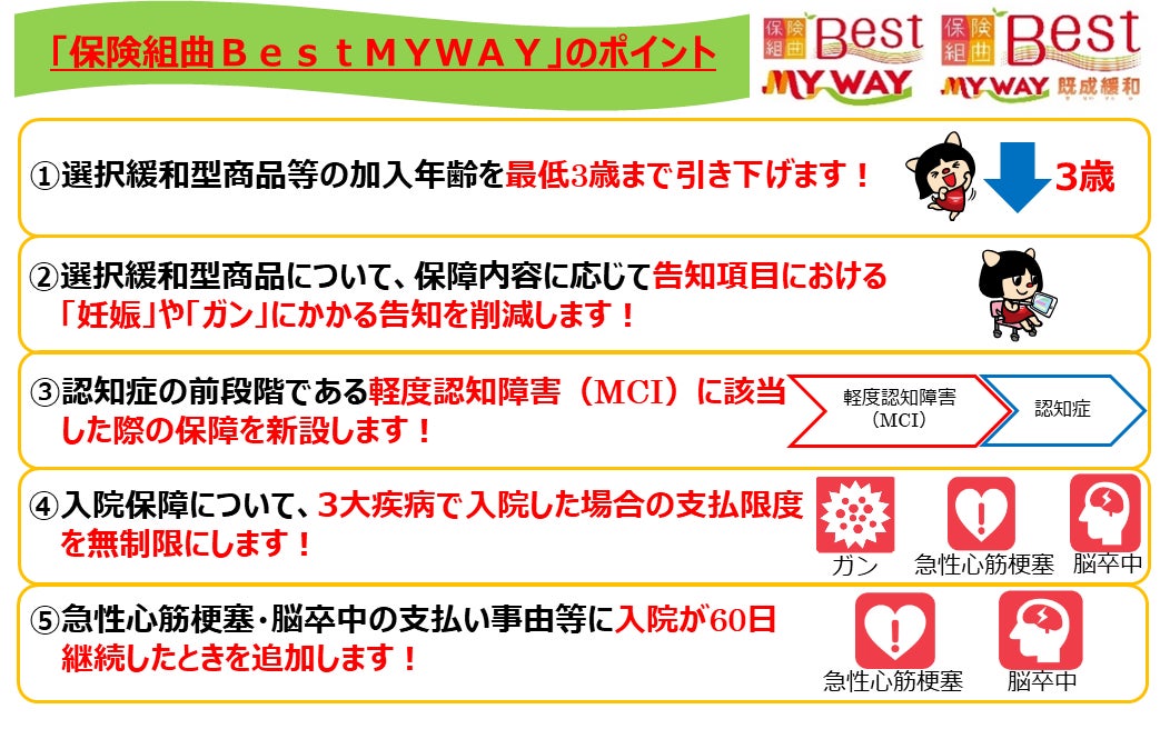 今般、「保険組曲Best」は、より多くのお客様に寄り添えるよう、発売以来の大幅な見直しを実施し、このたび新シリーズ「保険組曲BestMYWAY」を発売いたします。新名称は、“お客様の人生という道に、もっともっと寄り添えるように”、そして、お客様の“これからもずっと、わたしらしく”という気持ちを応援したいという想いが込められています。