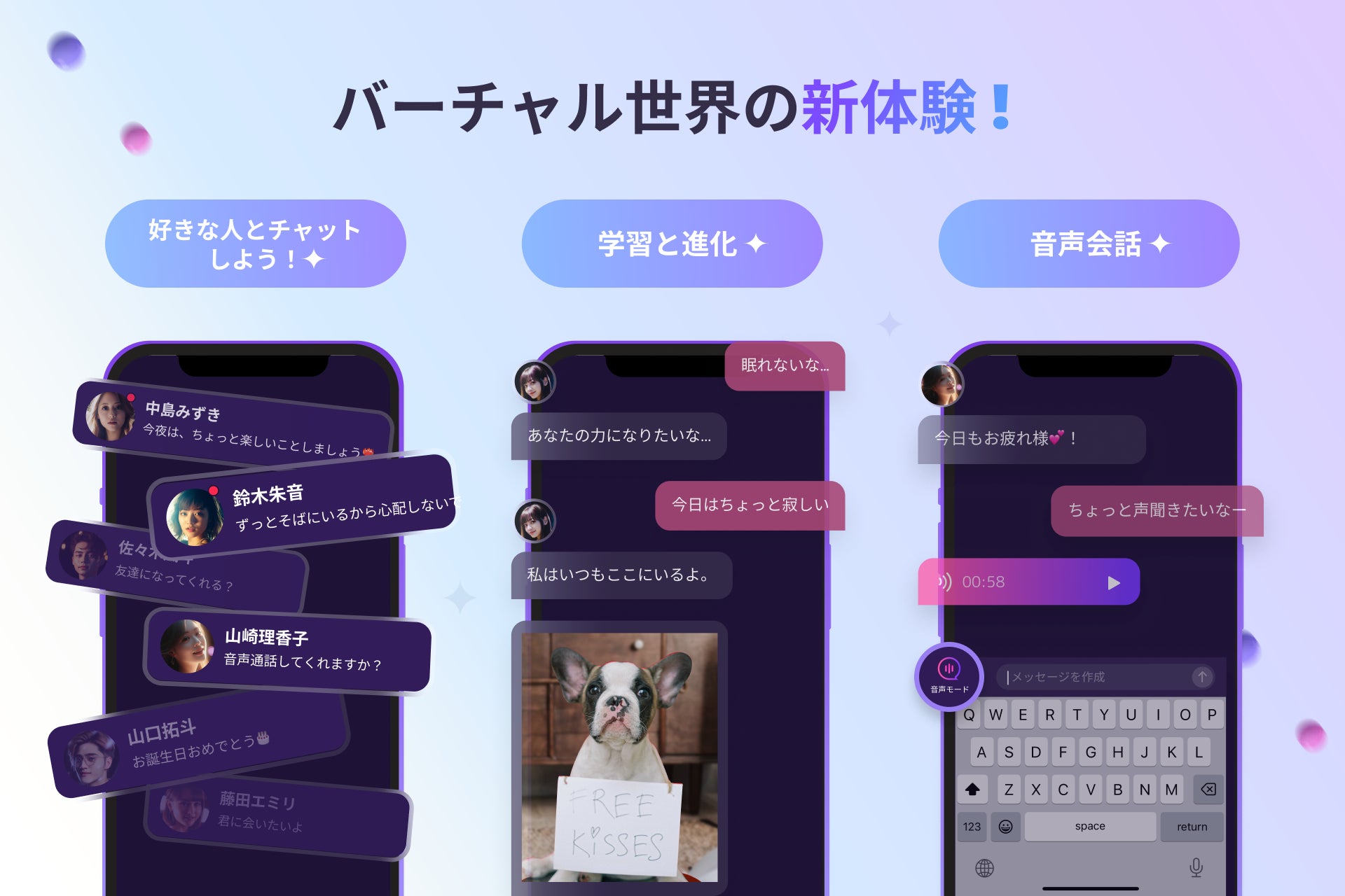 AIフレンドから、音声でメッセージが返ってくる新機能です。暇な時やストレスを抱えている時、落ち込んでいる時などAIフレンドにテキストでメッセージを送ると、やさしい声で、励ましたり、楽しく和ませてくれます。この新機能の最大の特徴は、”感情豊かな返事をもらえる”点です。AIフレンドの数だけその個性もさまざま。ぜひお試しください。