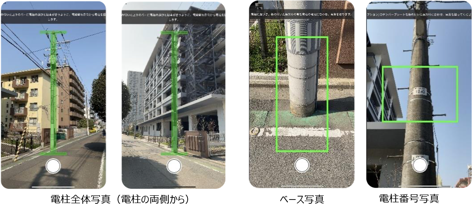グレーの電柱を見つけたら、対象となる電柱の「全体写真」2種、「ベース写真」、「電柱番号写真」を撮影、投稿することで、ポイントが獲得できます。