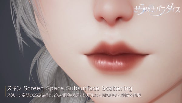 そして「きらめきパラダイス」ではどんな肌の色でもきめ細かく透き通って見せる、高度な技術「SSSモデル(スクリーン空間表面下散乱)」を採用しています。これは「ハリーポッター」や「ロードオブザリング」などの海外映画にも使われているもので、実写の映像に溶け込んでも違和感がないほど人間の肌の質感を再現する技術です。「きらめきパラダイス」のキャラクターは実物と同じように、皮膚の下で光を屈折させているため、肌に生きた温もりを感じることができるのです。