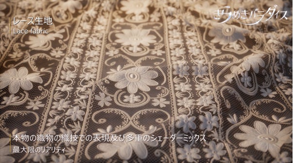 「きらめきパラダイス」では一種類の生地を作成するのにも、何層も質感を重ねて、実物の生地に近づけています。一本一本の糸を紡ぎ、実際に生地を作るのと同じような、細かな作業を行っているのです。更にリアルな編み目にシェーダーを加えているため、どこから見ても違和感のない生地に仕上がります。