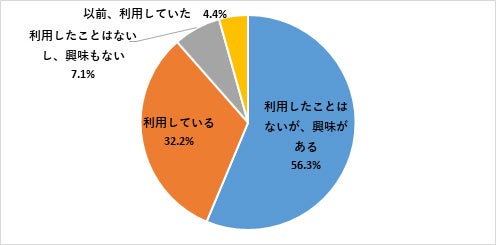 高機能の交換式シャワーヘッドについて利用状況をたずねたところ、「利用したことはないが興味はある」と回答した人が最も多く56.3%と半数以上である一方で、「利用している」人は32.2%。関心を持つ人の多さほどには商品が普及しきっておらず、今後も成長が期待できる市場であることが伺えます。