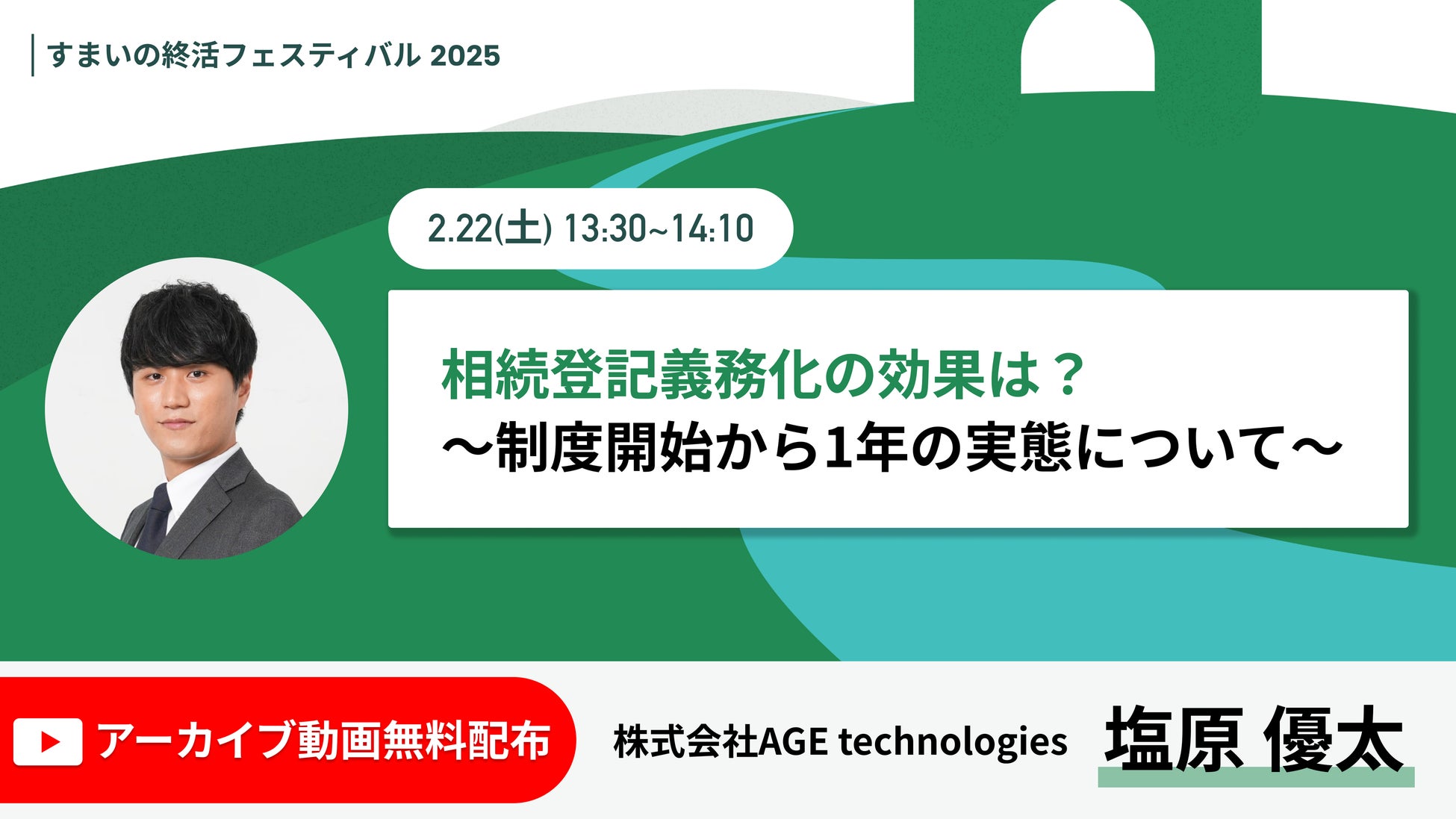 2025年2月20日(木)〜2月22日(土)に開催された「すまいの終活フェスティバル2025(※4)」の 3日目に、当社代表の塩原が登壇いたしました。「相続登記義務化の効果は?〜制度開始から1年の実態について〜」というタイトルで、本調査の結果解説を中心とした内容となっております。
