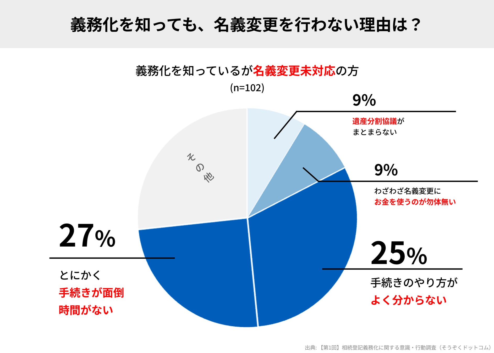 名義変更をしていない人の理由として、手続きの煩雑さや、面倒などの理由が多く、ここが課題。