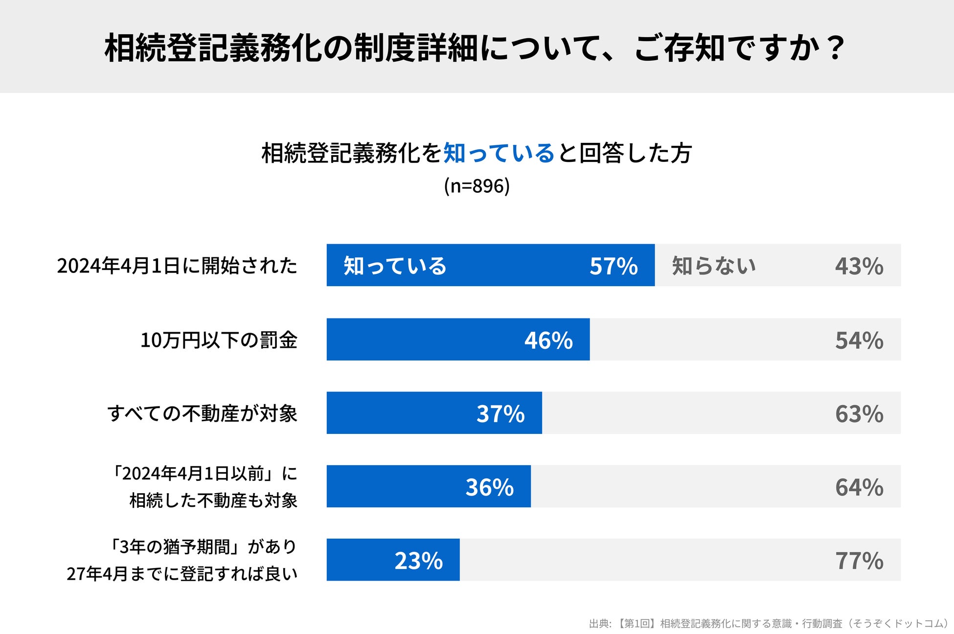 相続登記義務化について「知っている」と回答した方に、各制度の詳細、ルールについての認知度調査を実施した。結果、「2024年4月1日に開始されたこと」については、57%の方が「知っている」と回答したが、それ以外の詳細、ルールについては、過半数の方が「知らない」と回答した。