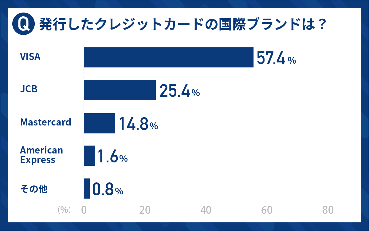 調査対象者のうち半分以上の57.4%が『VISA』を選択しており、特に利用者数の多い国際ブランドであるとわかります。