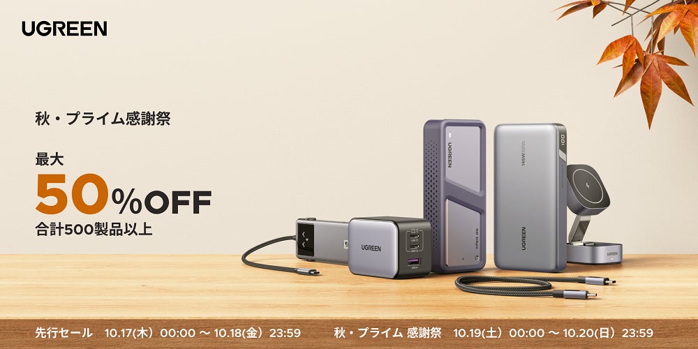 2024年10月19日(土)0:00から10月20日(日)23:59までAmazonで開催される「秋・プライム感謝祭」において、UGREENの人気製品を含む500製品以上が、最大50%OFFでお買い求めいただけます。また、10月17日(木)0:00からは「先行セール」を実施いたしますので、対象製品をいち早くご購入いただけます。先行セール(10月17日(木)0:00~10月18日(金)23:59)と、秋・プライム感謝祭(10月19日(土)0:00から10月20日(日)23:59)のセール期間中も、同じセール価格でご購入いただけます。