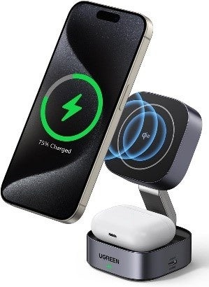 本製品は、Qi2急速充電認証とMagSafe充電に対応しており、iPhone最大15W出力でワイヤレス充電が可能です。ワイヤレスでiPhoneとAirPodsを同時に急速充電、右側にはUSB-Cポートを備えており1台3役の充電器です。また、折り畳み式となっており、出先や旅行先でも便利にお使いいただけます。