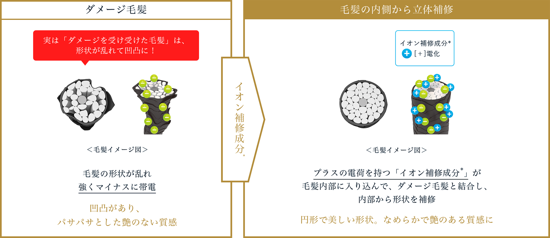 ◆毛髪の『断面形状変化』に着目。イオン補修成分※3が髪の深層部にまで届き、毛髪一本一本を立体的に補修。