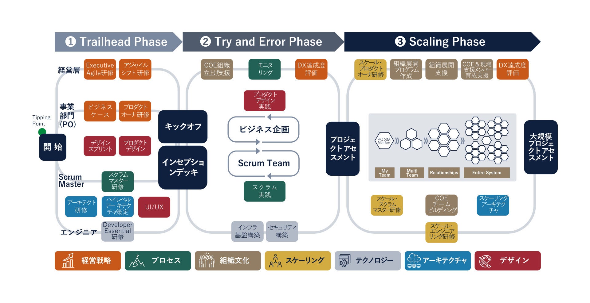 Trailheadフェーズでは、経営層や事業部門を含む関係者への導入教育と、アジャイルスクラムチームの選定、教育を行い、組織としてのアジャイル実践体制の立ち上げを支援します。Try and Errorフェーズでは、全社展開のためのCoEを立上げ、アジャイルスクラムチームに伴走し、アジャイルの実践と改善を進めます。そして、Scalingフェーズでは、複数のスクラムチームを有機的に連動させ、徐々に拡大することで、組織全体で俊敏性と柔軟性を兼ね備えた競争優位性のあるアジャイル組織構築を支援します。