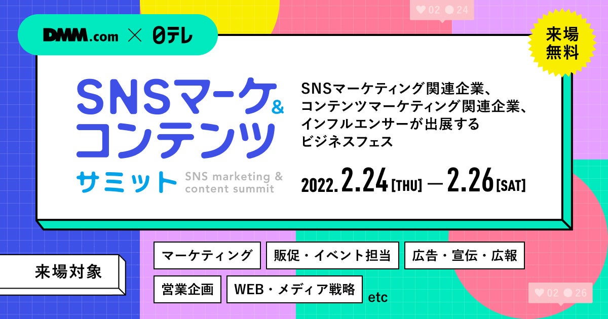 合同会社DMM.com(東京都港区、会長 兼 CEO 亀山敬司 以下、「DMM」)と日本テレビ放送網株式会社(本社:東京都港区、代表取締役 社長執行役員:杉山美邦 以下、「日本テレビ」)は、2022年2月24日(木)から2月26日(土)の3日間で共同開催するビジネスフェス『SNSマーケ&コンテンツサミット』の無料来場者登録を、1月26日(水)より開始いたします。なお、無料出展申込みも引き続き受け付けております。