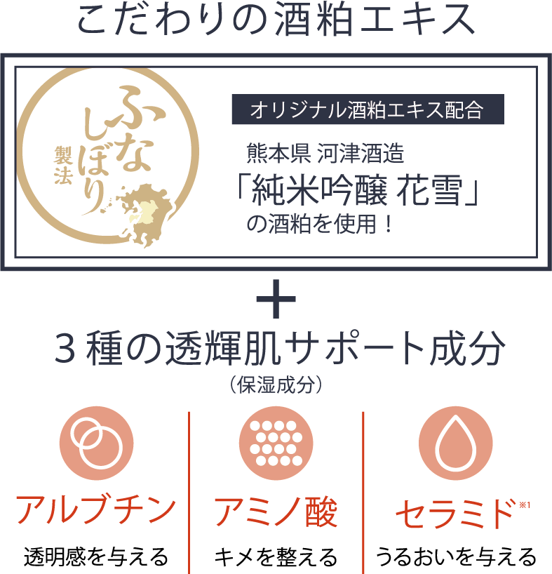 こだわりの酒粕エキス + 3種の透輝肌サポート成分(保湿成分)配合。