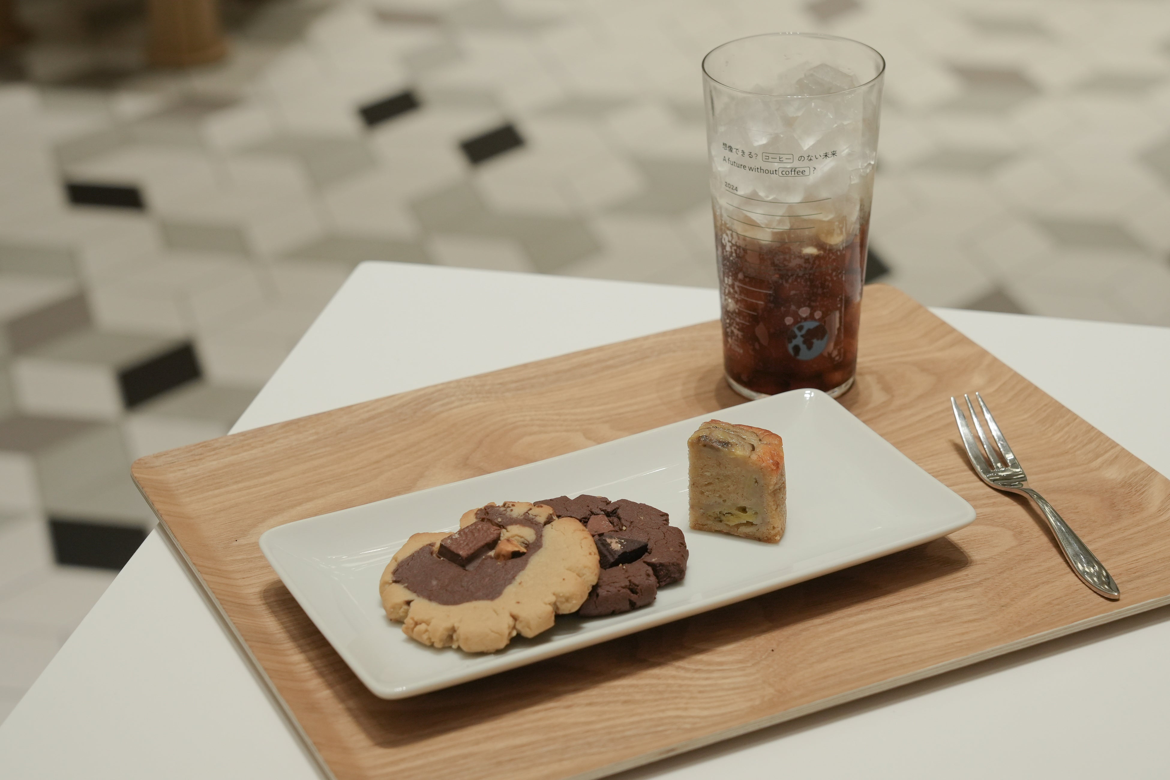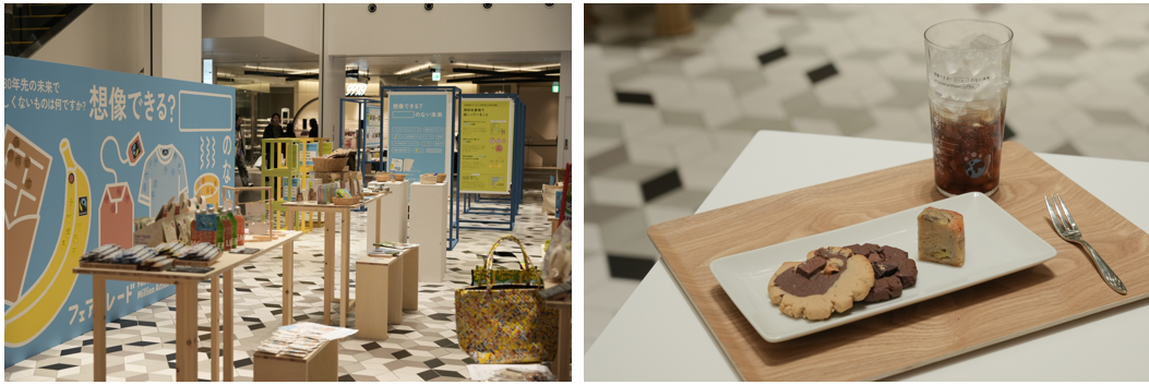 フェアトレード大学である青山学院大学が企画・運営に入り、学生たちとの産学連携プロジェクトとして、5月9日から22日まで「フェアトレード×気候変動」をテーマに食べて、学んで、買える体験型のPOPUPショップを渋谷スクランブルスクエアで開催しました(株式会社 Innovation Design協力)。会場では学生たちがセレクトしたフェアトレード商品の販売のほか、未来の食をイメージした「2050年カフェセット」として容量半分のコーヒーやスイーツの販売や、フェアトレードを楽しく学ぶクイズパネルなどを設置しました。