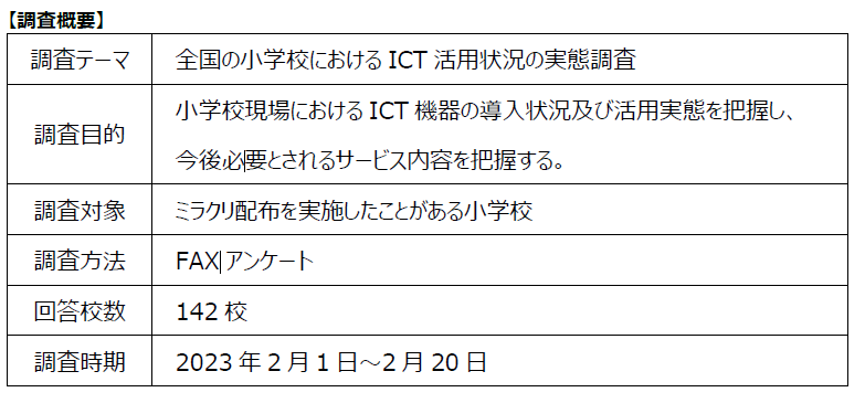 株式会社ソーシャルサービス(東京都千代田区霞が関3-6-5、代表/白形知津江)は、小学校におけるICT機器・サービスの導入状況および活用の実態について、アンケート調査を実施いたしました。本調査では、全国計142の小学校からの回答を集計。ICTの教育利用に関する傾向と課題について、分析結果を公開いたします。今回の調査結果を受け、ソーシャルサービスでは、小学校副教材「未来クリエイター(ミラクリ)」を通じて各小学校の実情に則した学校教育支援事業と、ICT活用のためのサポートに取り組んでまいります。