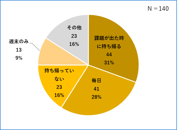 「毎日」「課題が出たとき」がそれぞれ約3割、「週末」を合わせると週1回以上自宅へ持ち帰る児童が全体の68%であった。「持ち帰っていない」も16%であった。持ち帰る頻度は学校によってまちまちである。