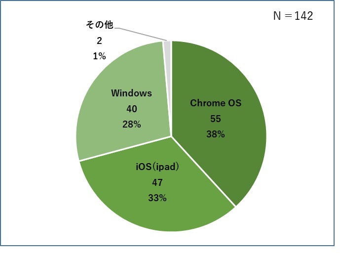 児童用のICT端末機器に使用されているOSのメーカー別割合は、Chrome OSが38%でトップ。 次いで