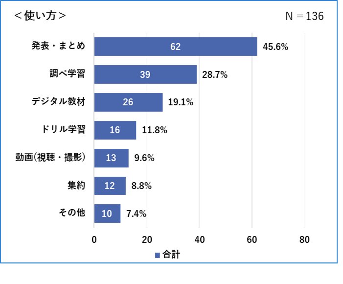 ▶ICT端末機器の活用法は「発表・まとめ」が約50%