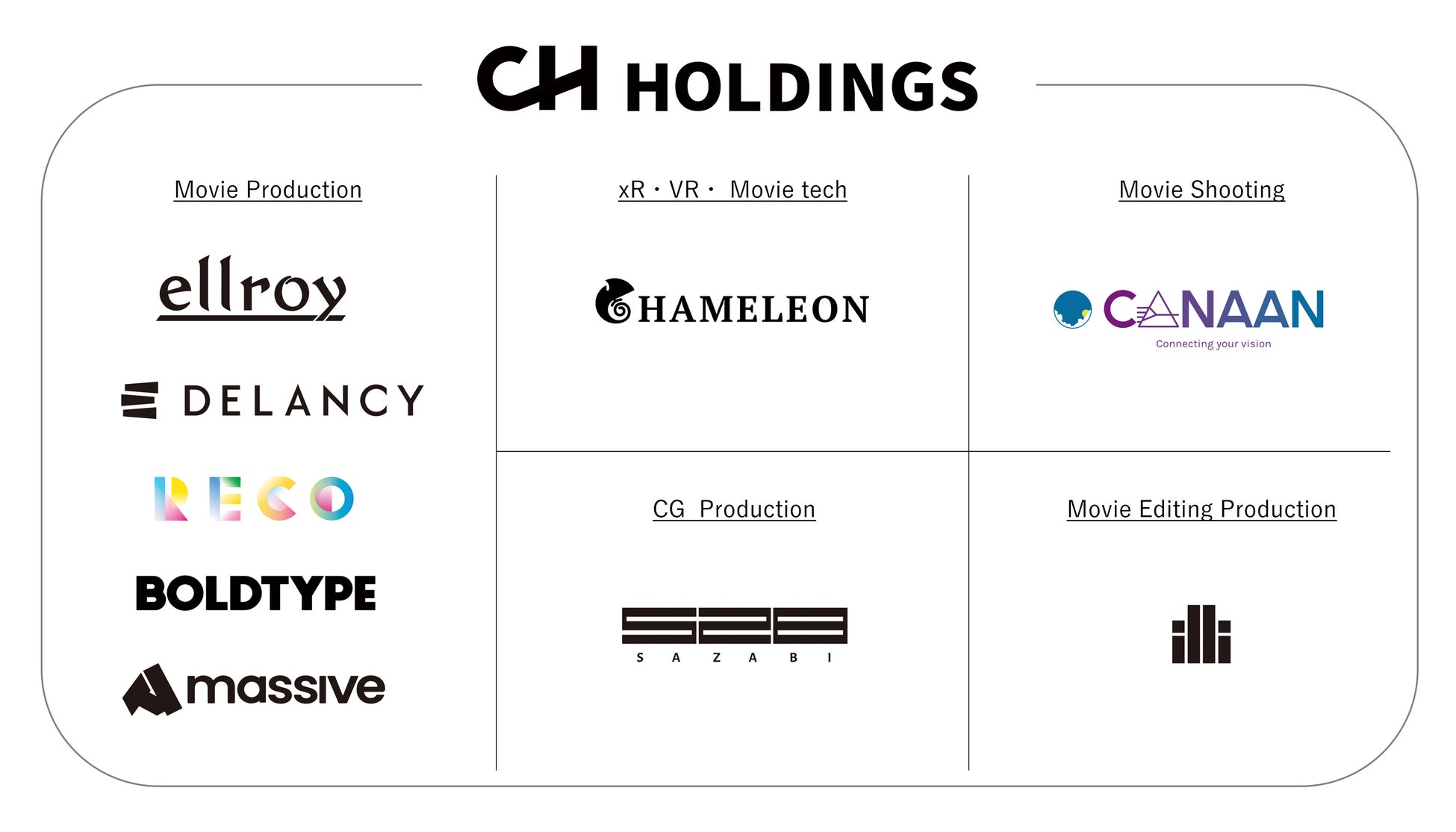 CHホールディングスは、エルロイを含む9社の映像制作関連企業で構成されるクリエイティブコングロマリットを形成しています。映像プロダクションのエルロイ、デランシー、RECO、ボールドタイプ、massive、CG・VFX制作のサザビー、モーショングラフィック制作のilli、先端技術のCHAMELEON、撮影技術のカナンなど、多様な専門分野の企業が協力し、約80名のスタッフで総合ビジュアルソリューションを提供しています。テレビCMやウェブムービーを中心に、ウェブやイベントなど広範囲にわたる分野で実績を上げています。また、CHホールディングスは起業プラットフォームとしても機能し、多くのクリエイティブ・スタートアップを創出し日本の創造産業の発展に貢献しています。