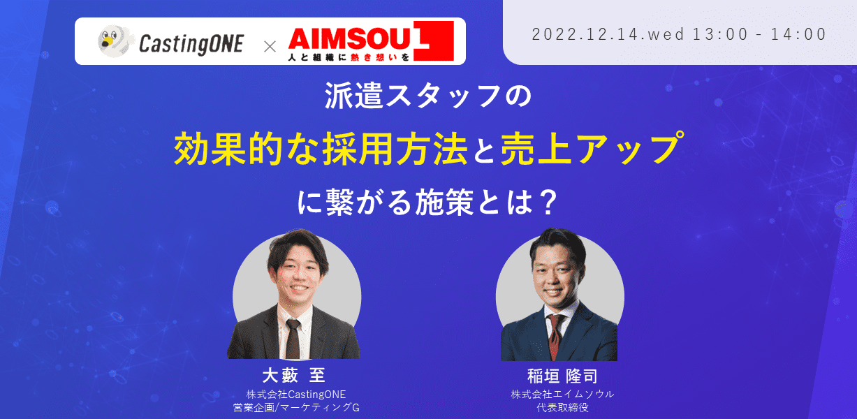 | 申込 | https://casting-one.jp/castingone-haken/news-event/event/aimsoul/?utm_source=prtimes&utm_medium=referral&utm_campaign=co-sponsored_seminar&utm_content=aimsoul |