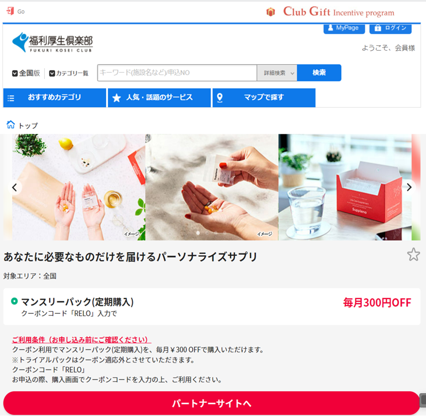 リロクラブが提供する会員制福利厚生サービス「福利厚生倶楽部」の会員は、以下の要件にて「Suppleno(サプリノ)」のサービスをご利用いただけます。