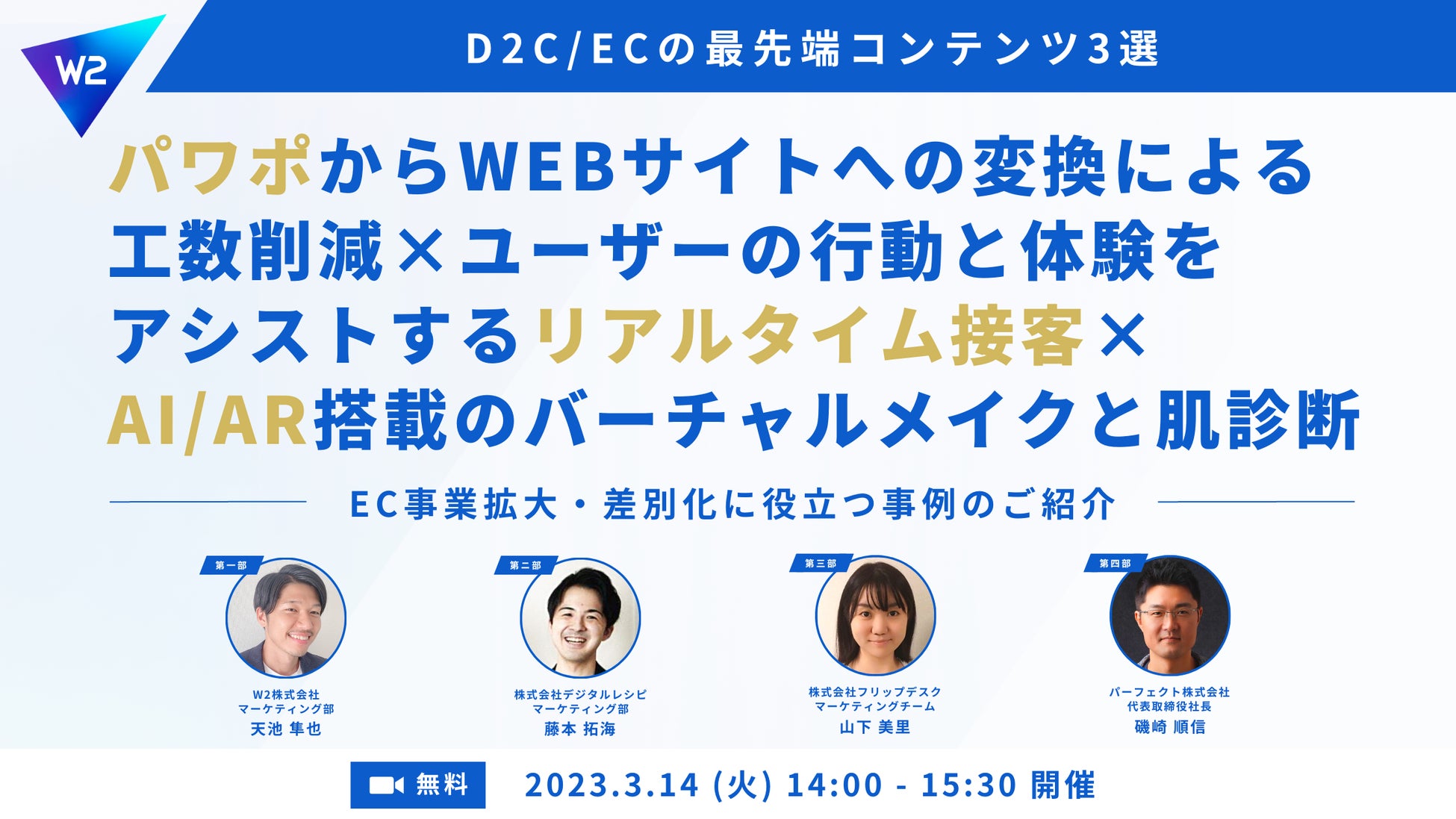 3/14【D2C/EC事業者必見!EC事業拡大・差別化に役立つ事例をご紹介!】株式会社デジタルレシピ、W2株式会社、株式会社フリップデスク、パーフェクト株式会社の4社共催による無料ウェビナーを開催!