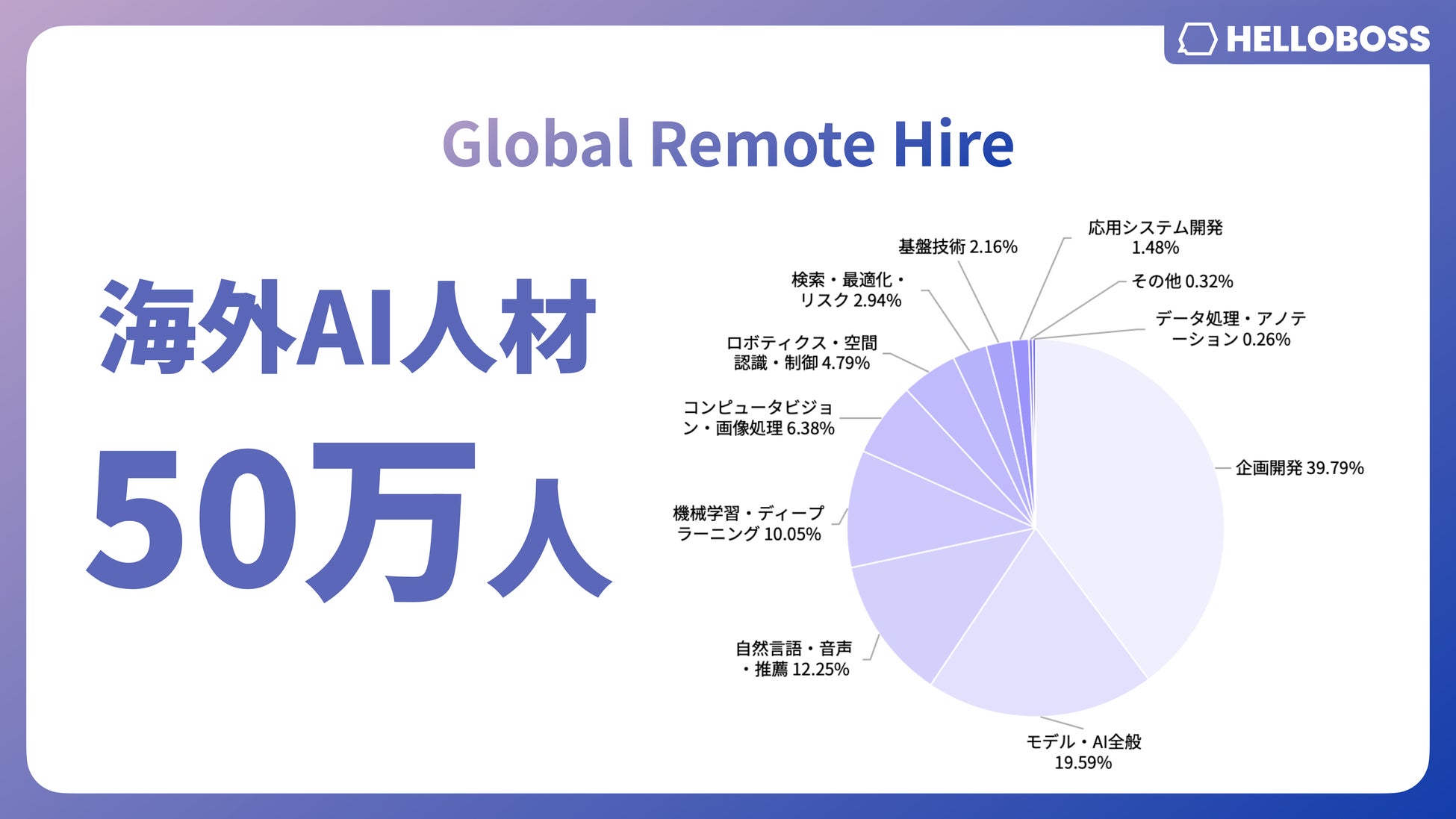 次世代オンラインサービスを開発・運営する株式会社NGA(本社:東京都港区、CEO:Alex Wang、以下「NGA」)が提供している第3世代AI採用サービス『HelloBoss』はこのたび、世界No.1*のEOR(Employer of Record/雇用主代行)事業を展開する米国発のデカコーン企業※Deel Inc.(本社:米国 カリフォルニア州 サンフランシスコ、CEO:Alex Bouaziz、以下「 Deel」)と業務提携し、日本企業向けに海外AI人材のリモート採用・雇用をワンストップで支援する新サービス「Global Remote Hire」をローンチしました。「Global Remote Hire」では、現地法人を持たずとも、『HelloBoss』との契約のみで、海外人材の選定から契約、給料の支払いまでのプロセスをすべてオンラインで完結可能です。『HelloBoss』の海外AI人材ネットワークと、Deel社のEORシステムを連携させることで、人材を3ヶ月単位でリモートで活用でき、企業が抱えるAI人材不足問題を本格的に解決するソリューションとなります。