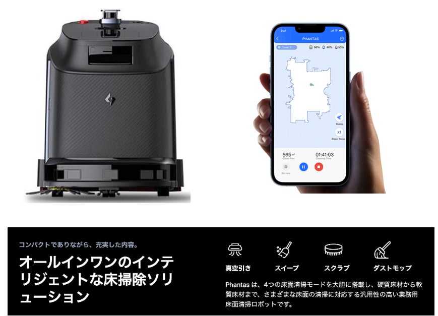 Phantasは、次世代型インテリジェント清掃ロボットです。自律型サービス産業における最新の画期的技術を取り入れ、高い生産性と費用対効果のあるオールインワン清掃ソリューションを提供します。Phantasは、自動スポット清掃、4つの清掃モードの統合(真空引き、スイープ、スクラブ、ダストモップ)、リアルタイムのローカライゼーション、3D環境認識など、さまざまな先進機能を有しています。Gausium アプリは、お手持ちのスマホからいつでもどこでも床清掃をコントロールすることができます。マップ編集、リモートコントロール、タスクスケジュール、データレポートなど、豊富なオプションが用意されています。