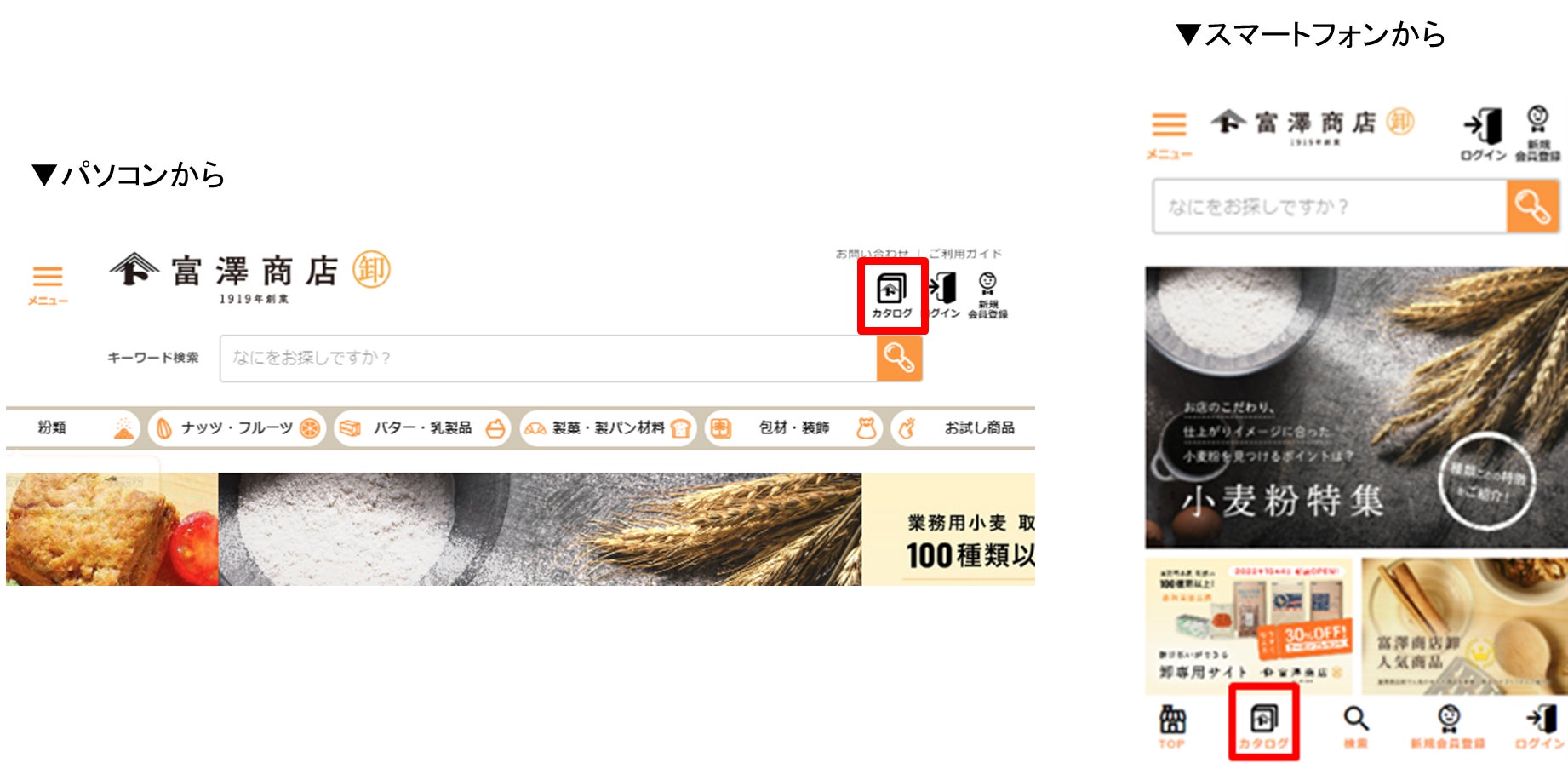 まずは、富澤商店 法人向け卸専用サイト(https://b2b.tomiz.com/)へアクセス。パソコン、スマートフォン、それぞれ下記赤枠の部分からカタログを閲覧することが可能です。