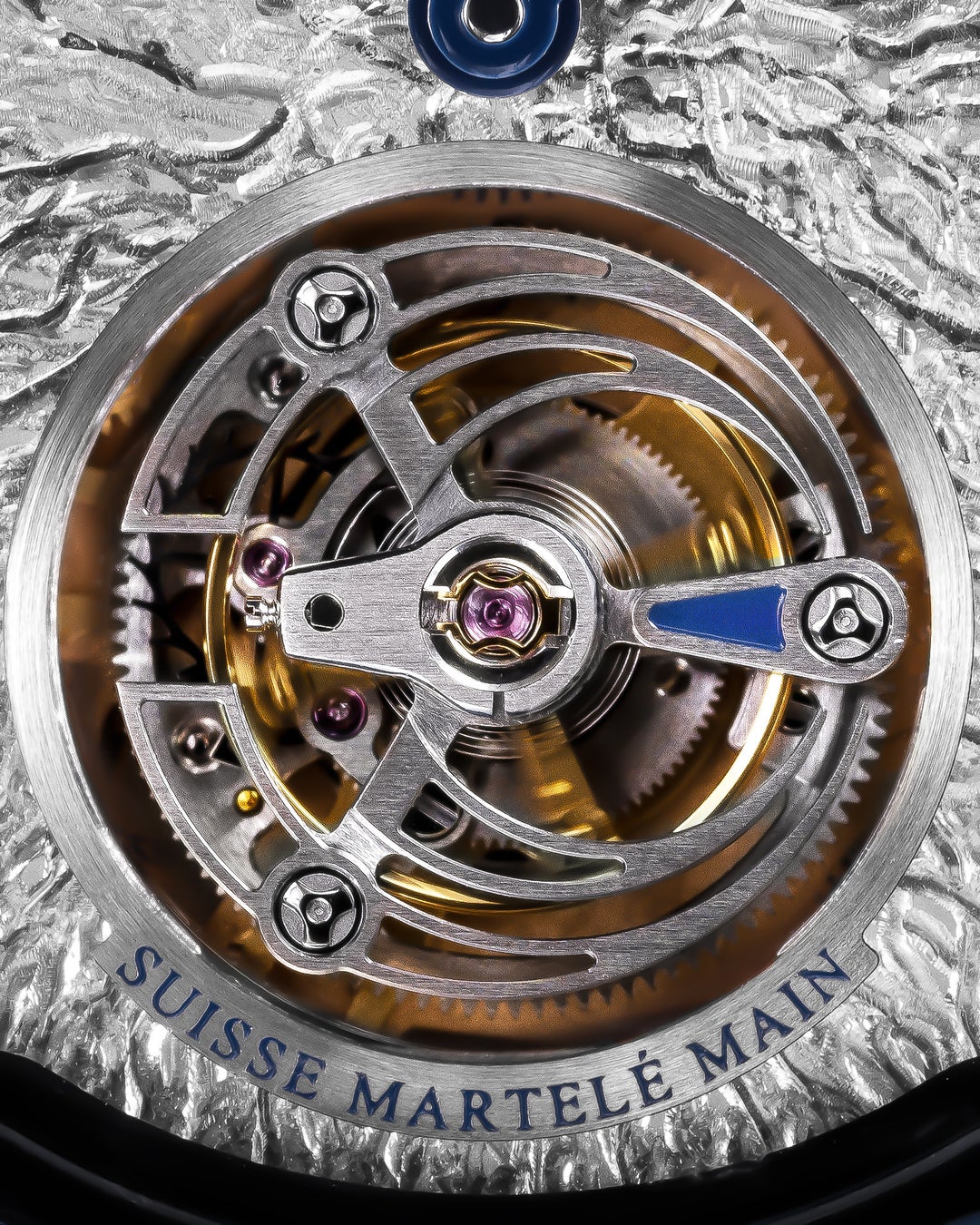 サージカル・グレードのステンレス・スティール製ケース、ゴールドのトゥールビヨン・ブリッジ、チタン製フライング・トゥールビヨン・ケージを組み合わせることで、自然で立体的なコントラストが生み出され、より鮮やかになりました。また、ケージの 「G 」の部分には、スモールセコンドを示すブルーのインジケーターが配されています。
