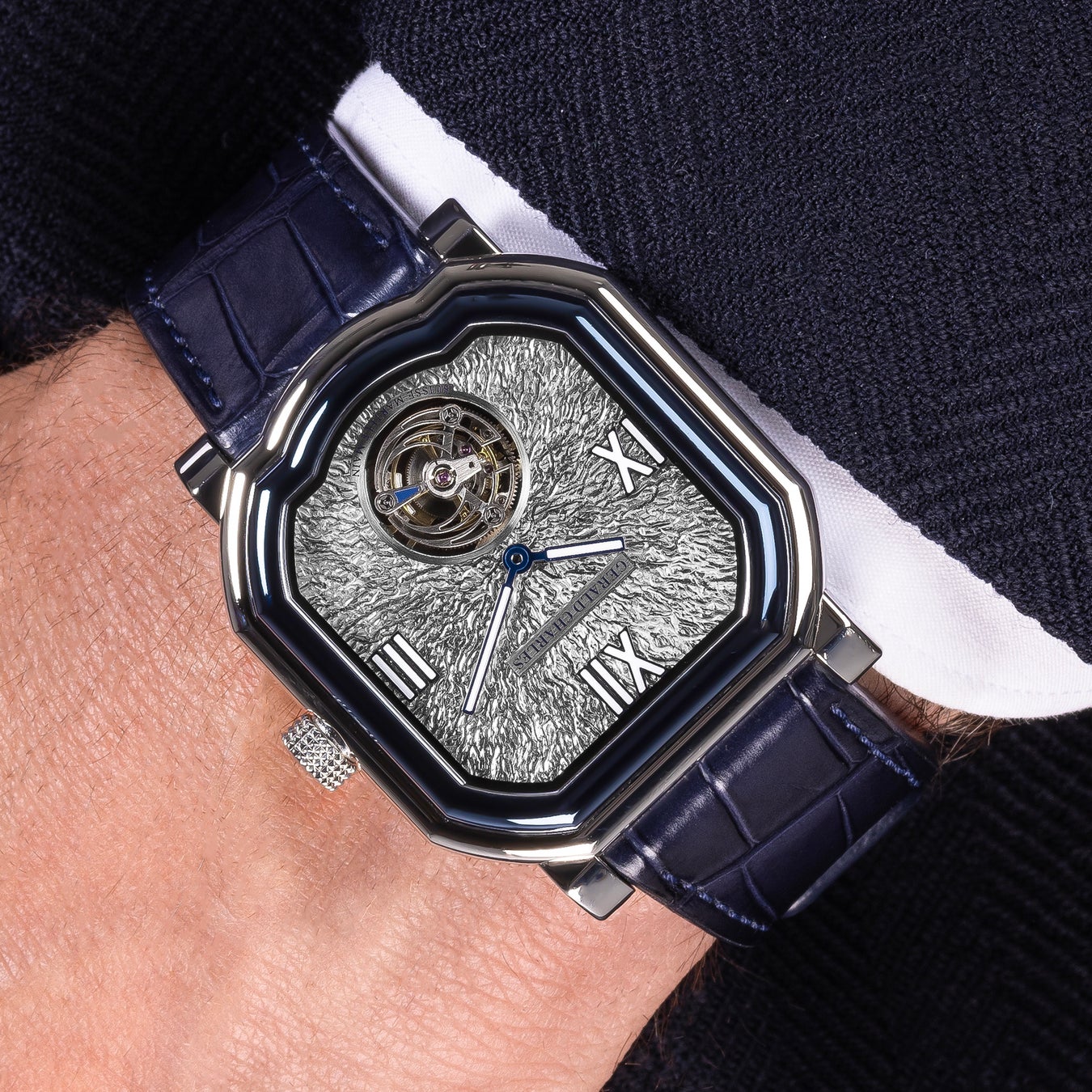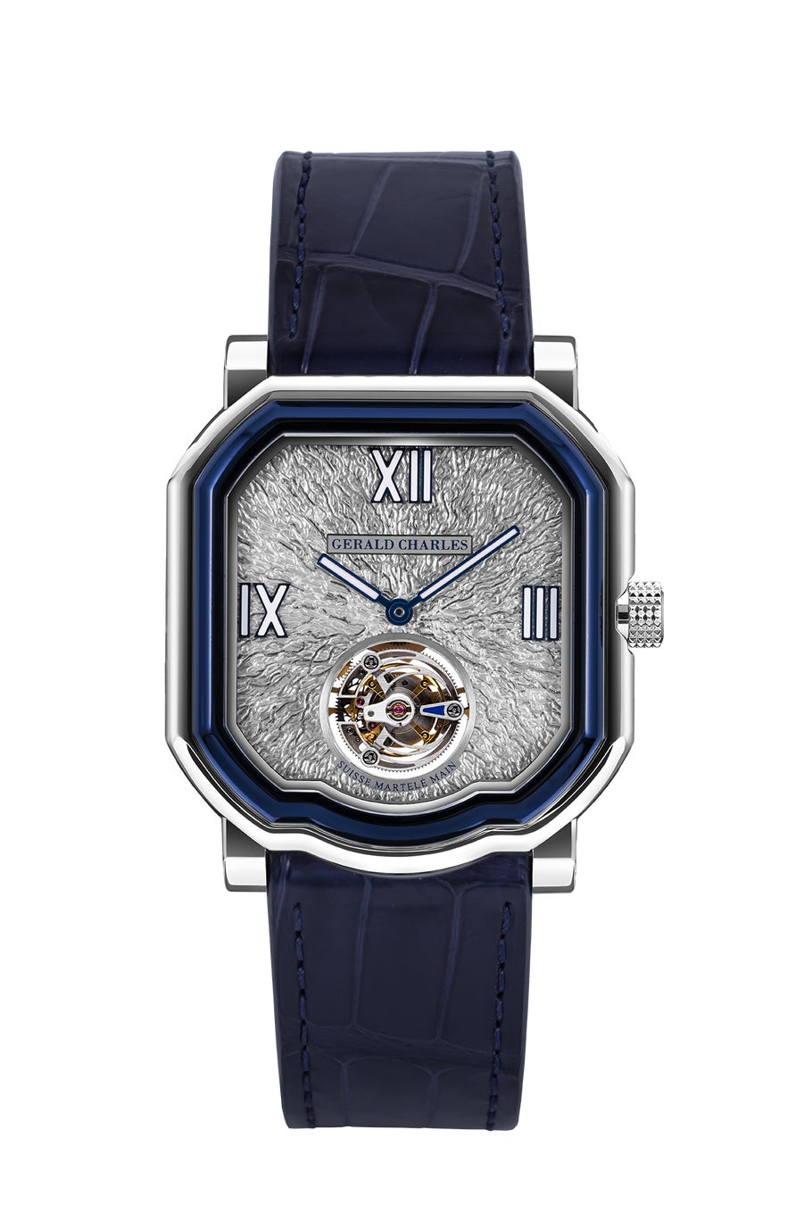 他のジェラルド・チャールズの時計同様、この時計を際立たせているのは、質感のある文字盤、アリゲーターストラップ、スケルトン・トゥールビヨンなどのディテールであり、エレガントでありながらスポーティなタイムピースであることを物語っています。コンテンポラリーでありながらオールドスタイルの風格を同時に漂わせる芸術的なハンドメイドを表現しているのです。